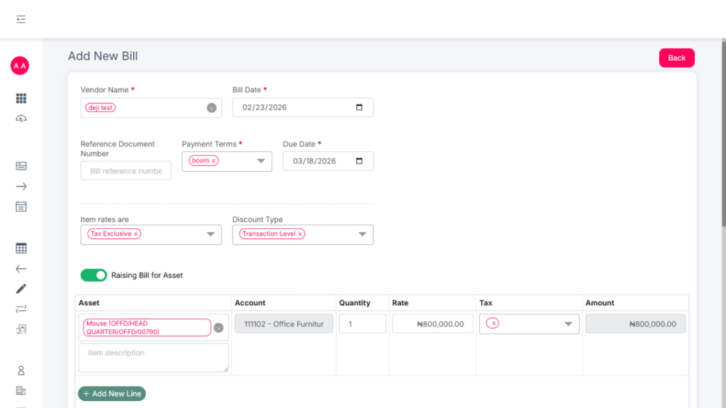 Users can toggle the “Raise Bill for Asset” button. This allows them to either: