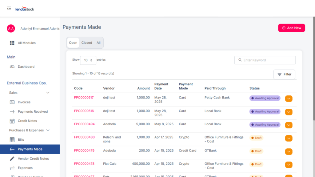 This section displays all payments made to vendors from created bills.