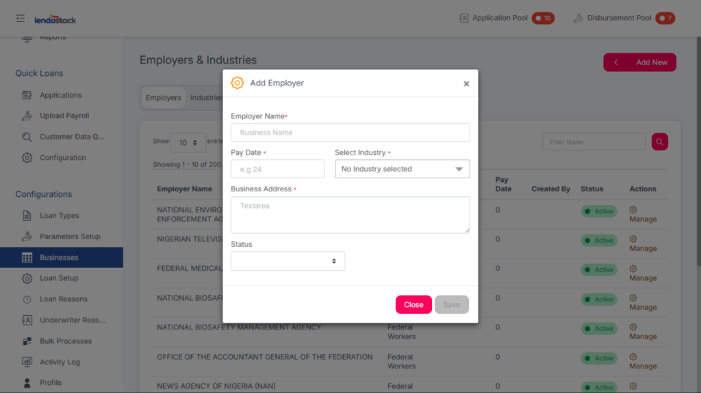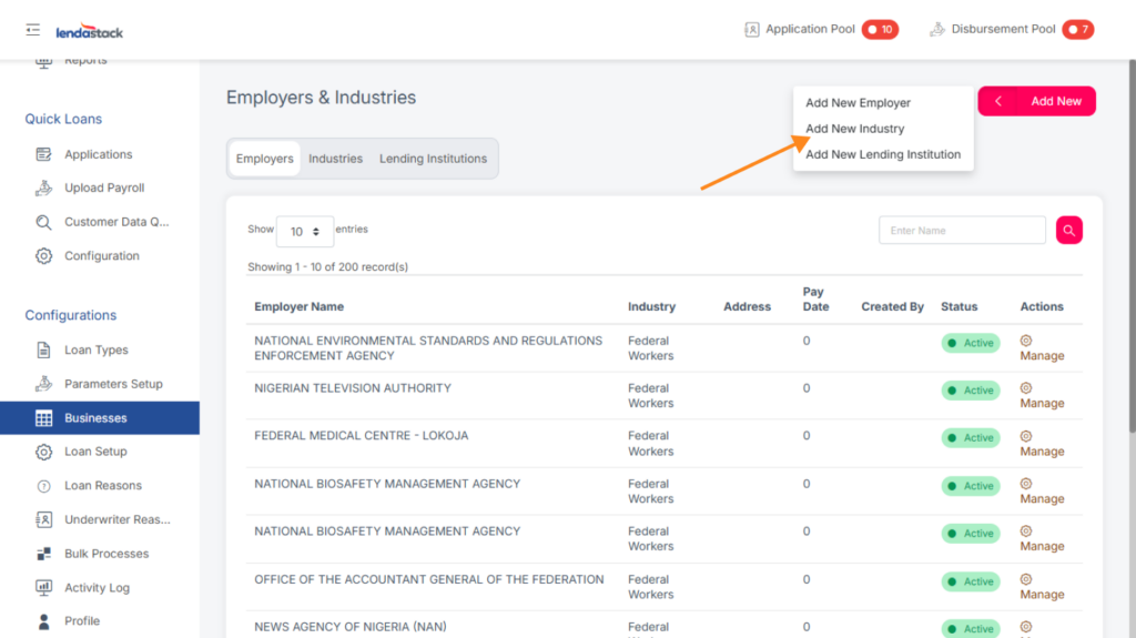 From the Business Module page, click the Add New button in the top-right corner. A menu will appear, allowing you to select and create a new Employer, Business Industry, or Lending Institution.