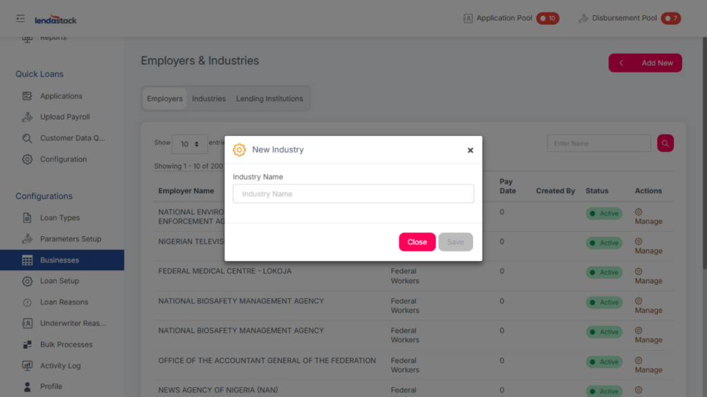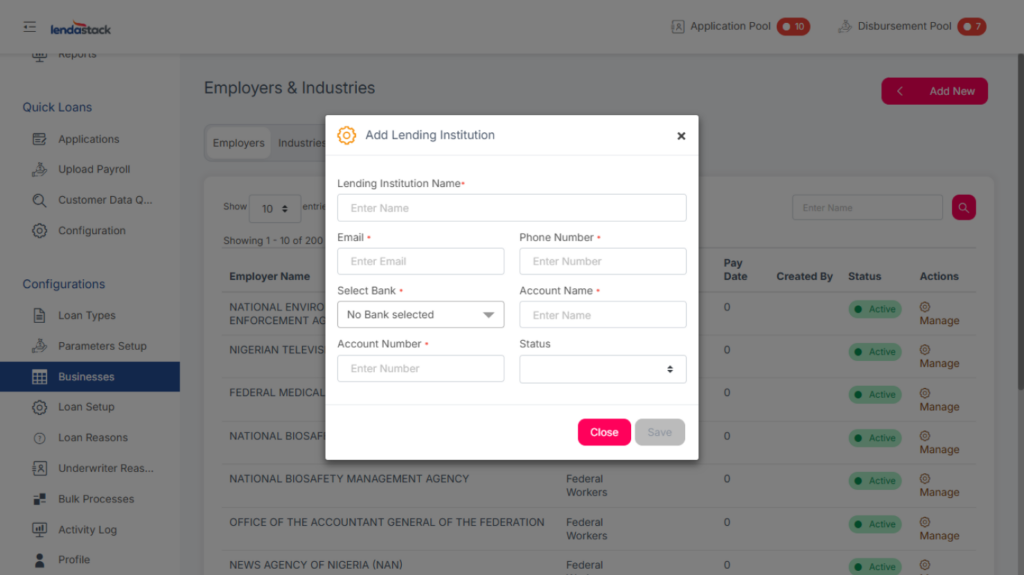 Setting Up Employers, Business Industries, and Lending Institutions