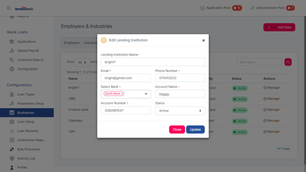 Required Permission: Create Lending Institutions, View Lending Institutions, Update Lending Institutions