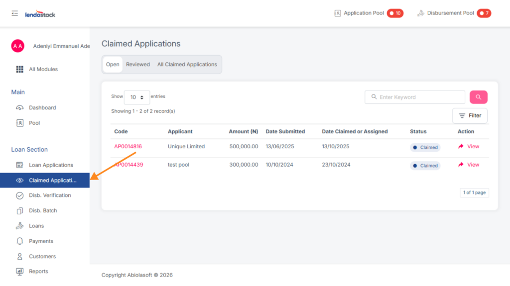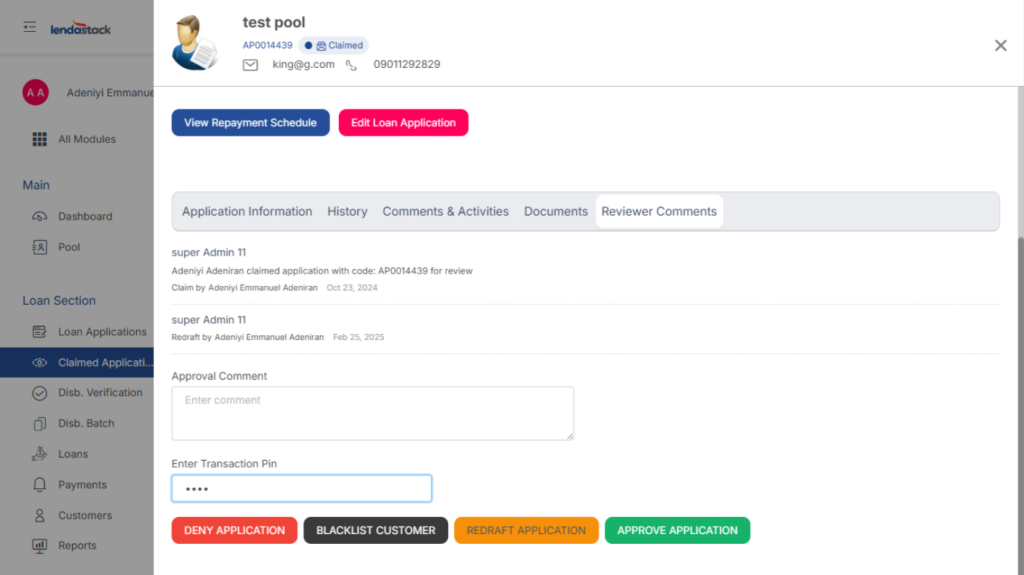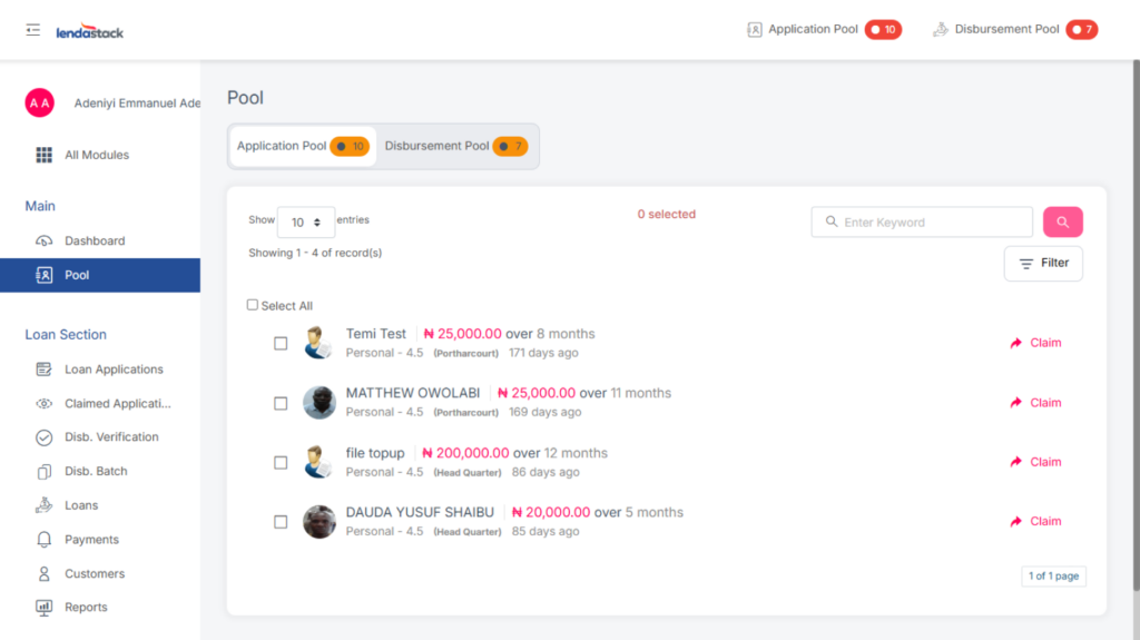 A list of loan applications will be displayed, each with a Claim button. By clicking this button and entering their Transaction PIN, a user can claim an application.