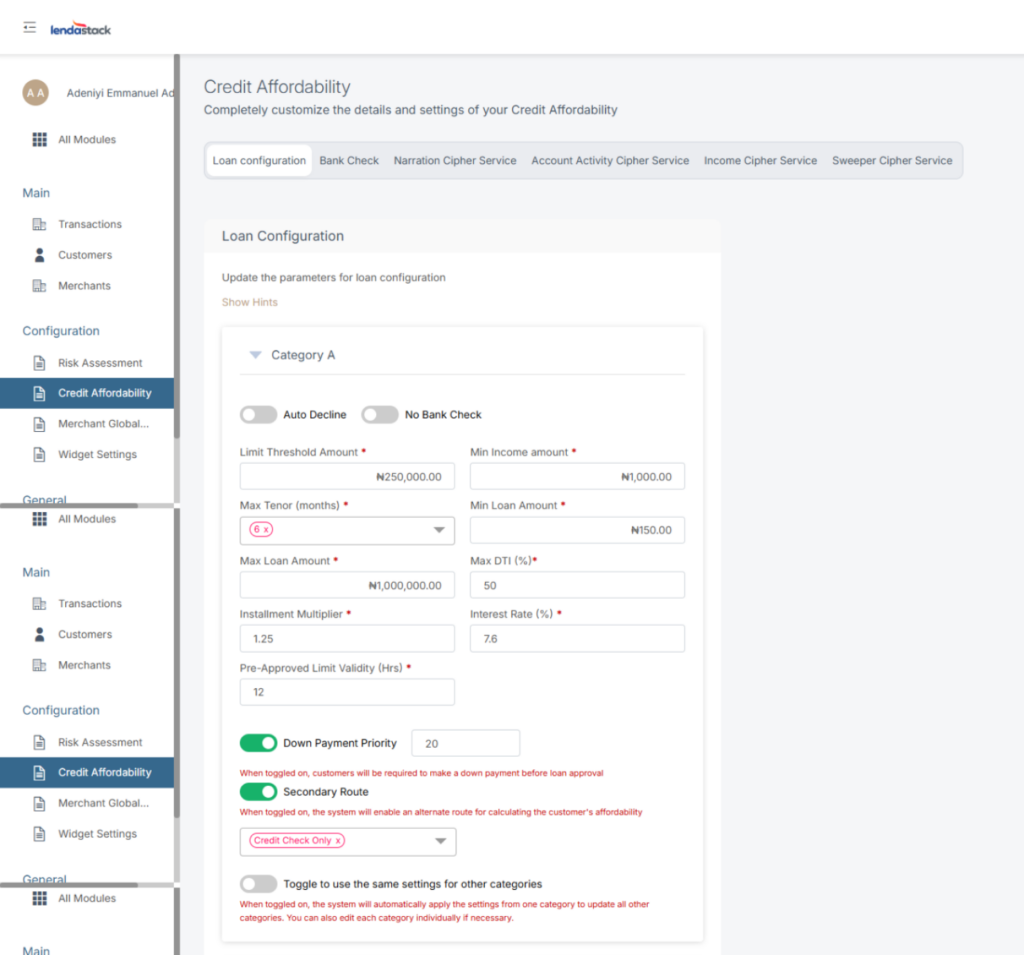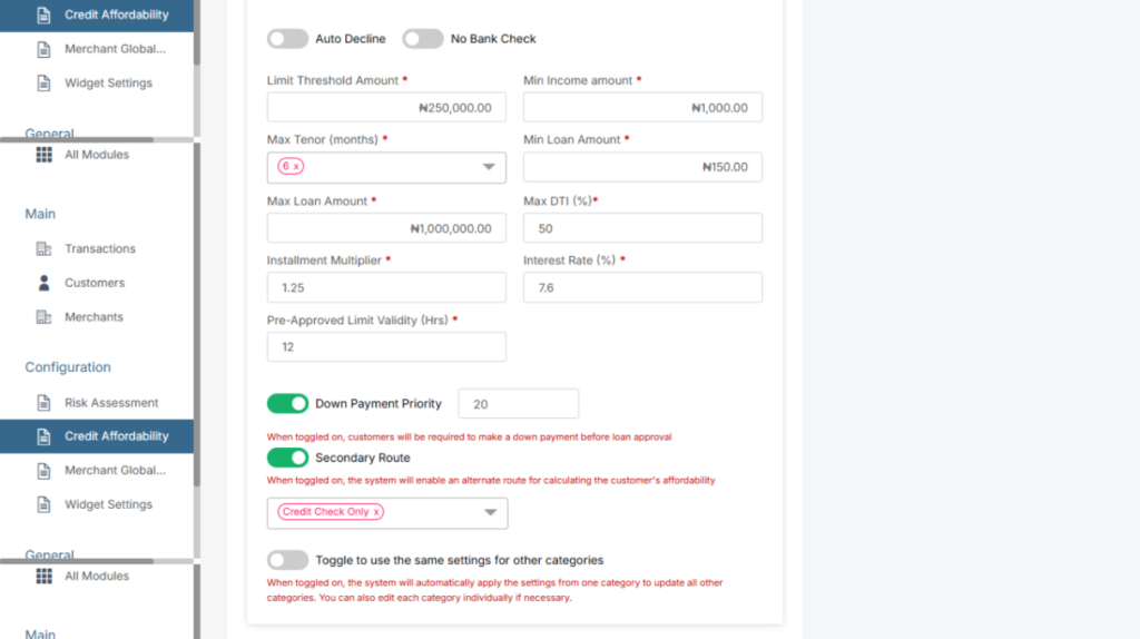 - Max Tenor (months): Users can set the maximum loan tenor (repayment period) in months by category for which all loan limits will be generated