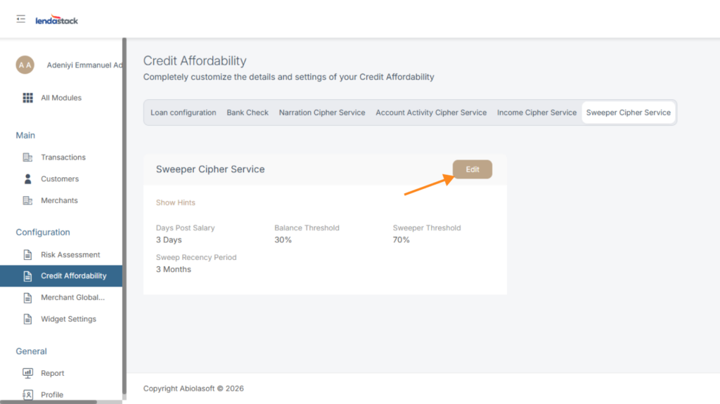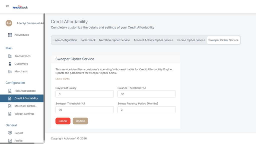 This service identifies a customer’s spending/withdrawal habits for Credit Affordability Engine. Update the parameters for the sweeper cipher below.