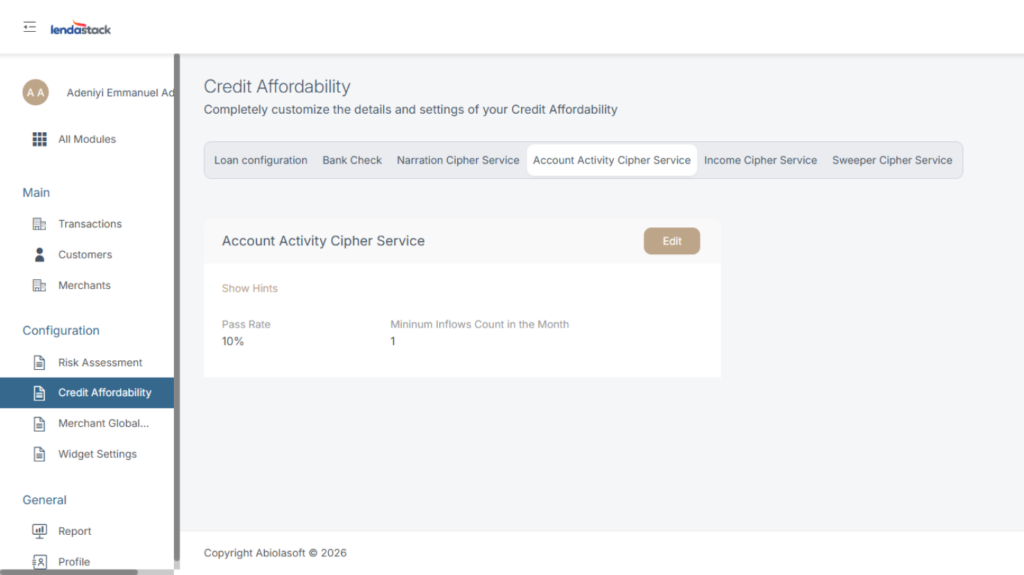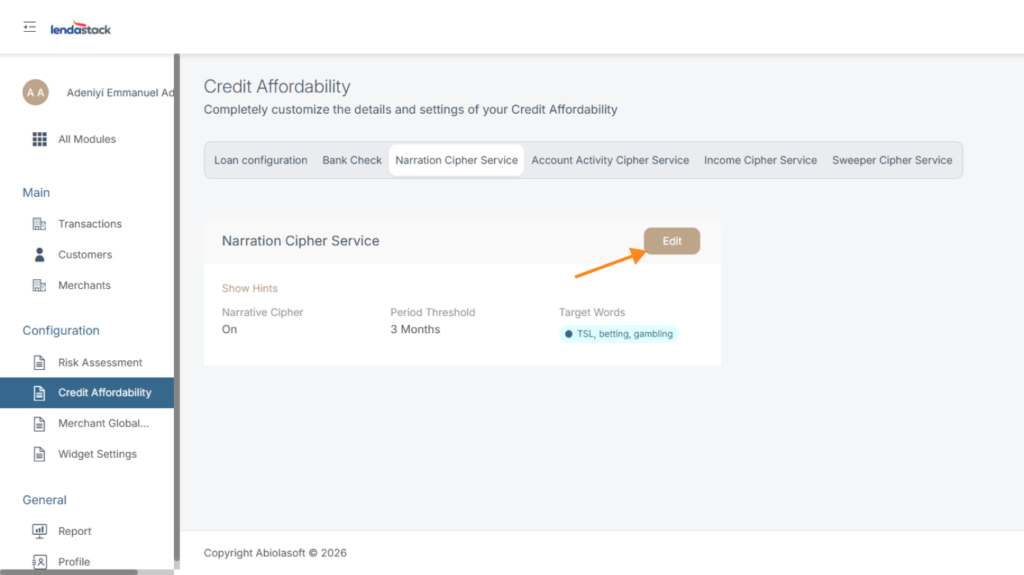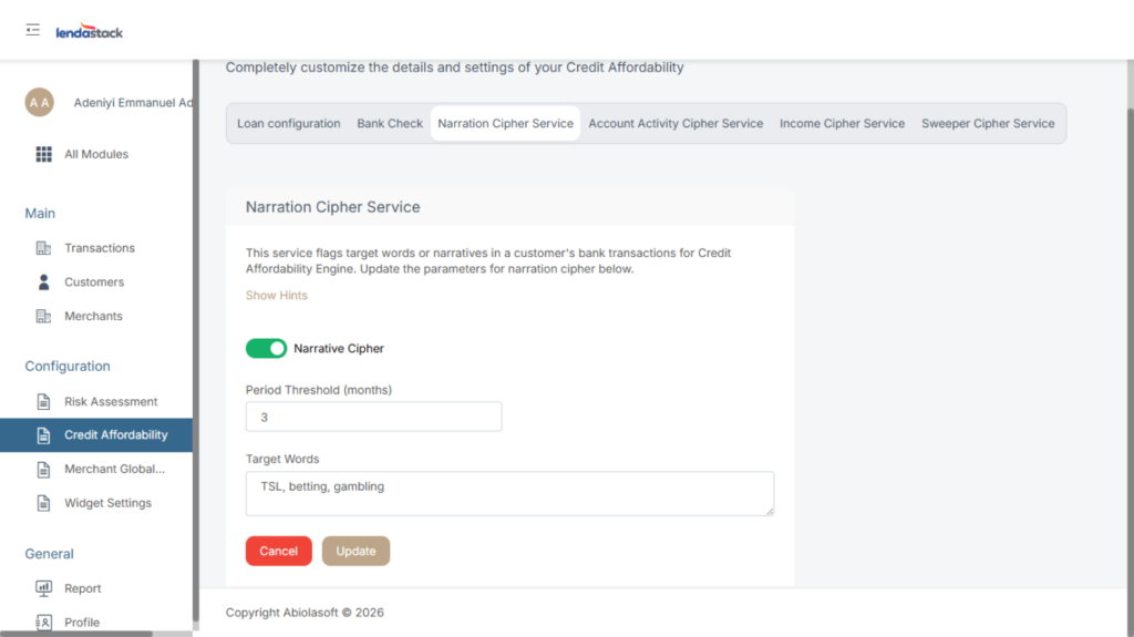 This service flags target words or narratives in a customer’s bank transactions for Credit Affordability Engine. See how to update the parameters for narration cipher below.