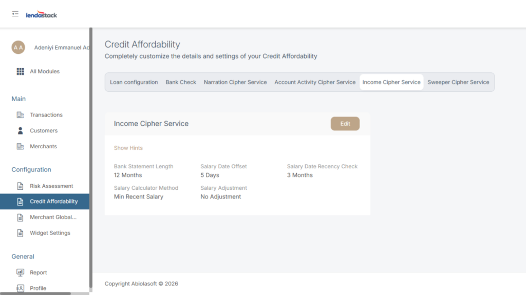 Once you click on Income Cipher Service, a modal pops up, click on edit on the top right Coner of the modal to update the parameters for Income cipher below.