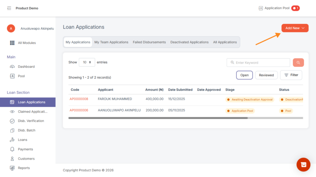 Once in the Loan Module, navigate to Loan Application from the sidebar. Then, click the Add New button located at the top right corner of the page.