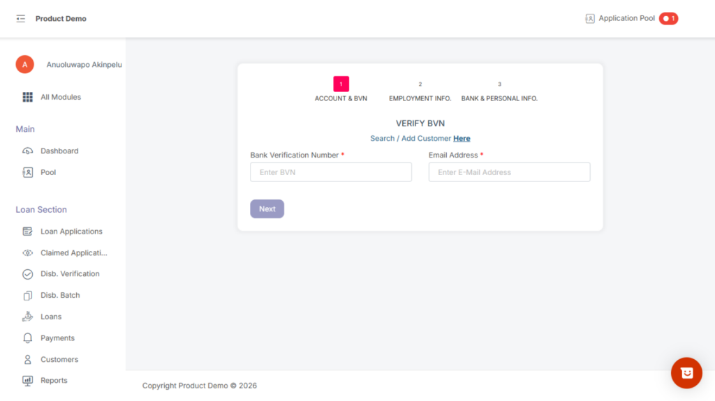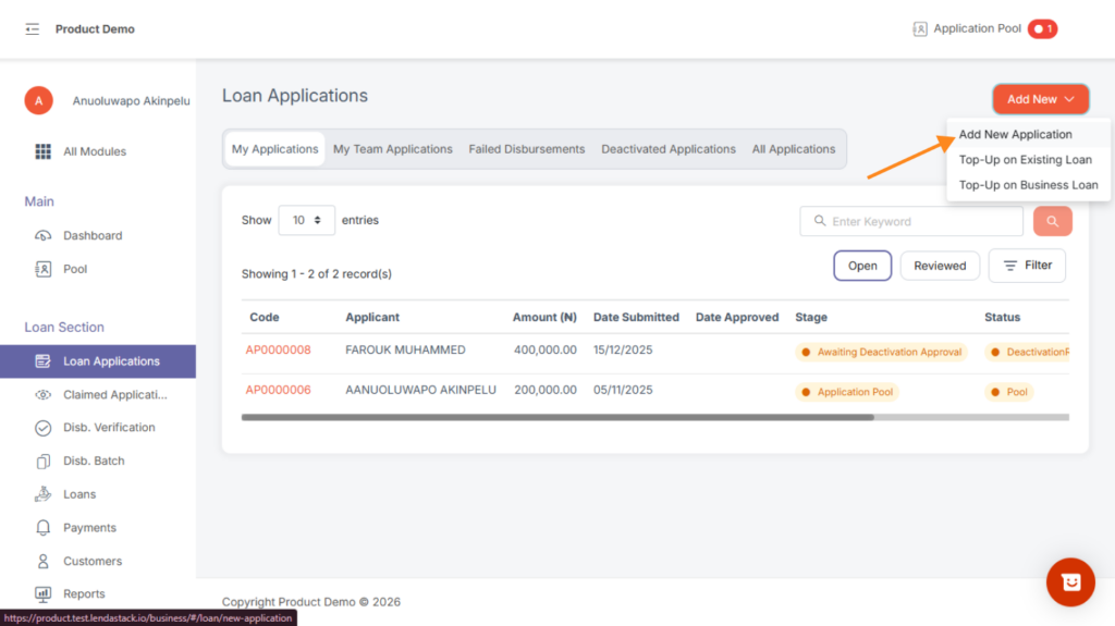 On the Add New page, select Add New Application to proceed. A modal will appear with a text field where you can enter a Code, Phone Number, First Name, Email Address, or BVN.
