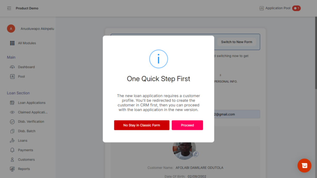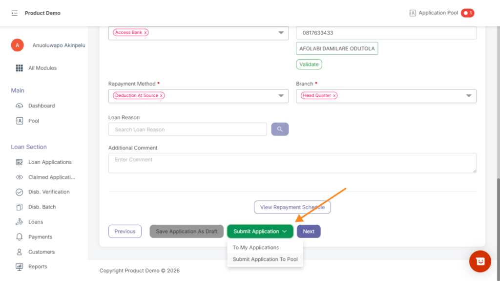 When a loan application is sent to the application pool, users with permission to View All Loan Applications can navigate to it through the sidebar by clicking Pool under the Dashboard in the main section