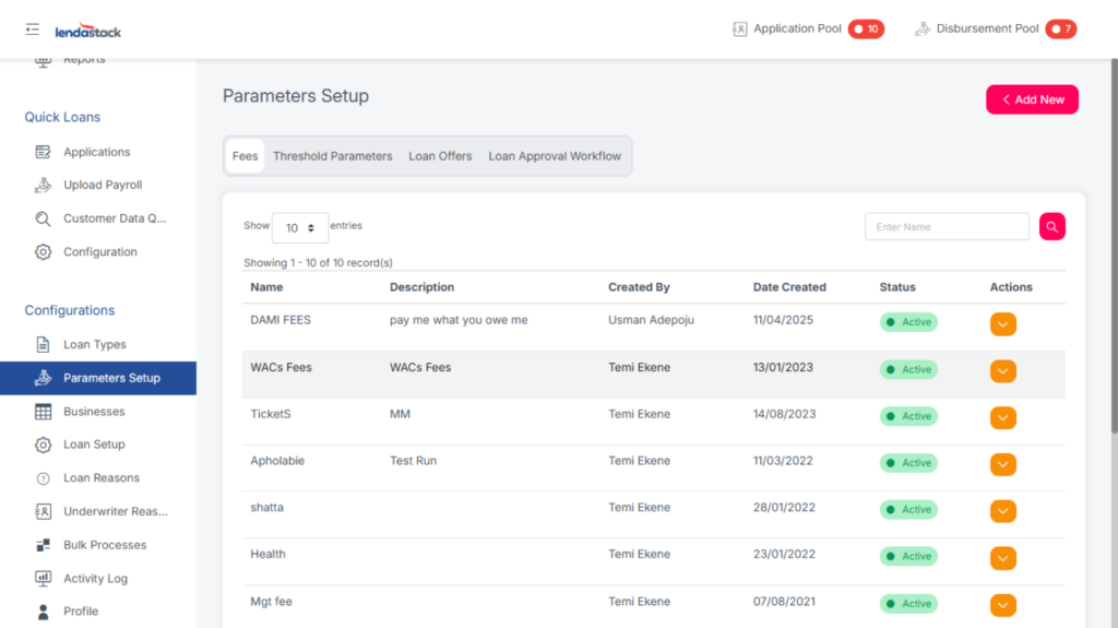 - On the Fees page, click the Add New button in the top-right corner.