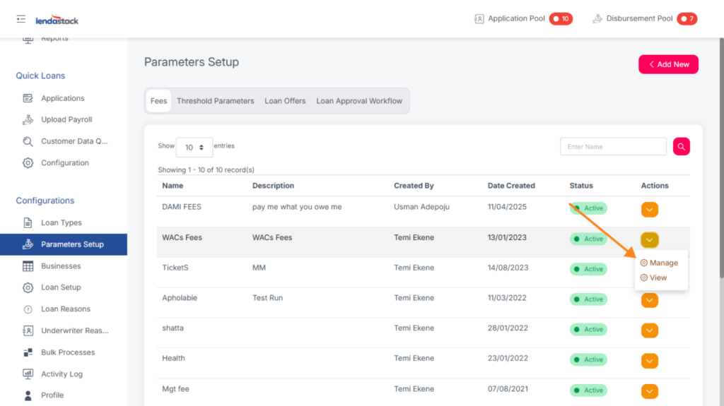 - Click the Manage button for the relevant parameter.