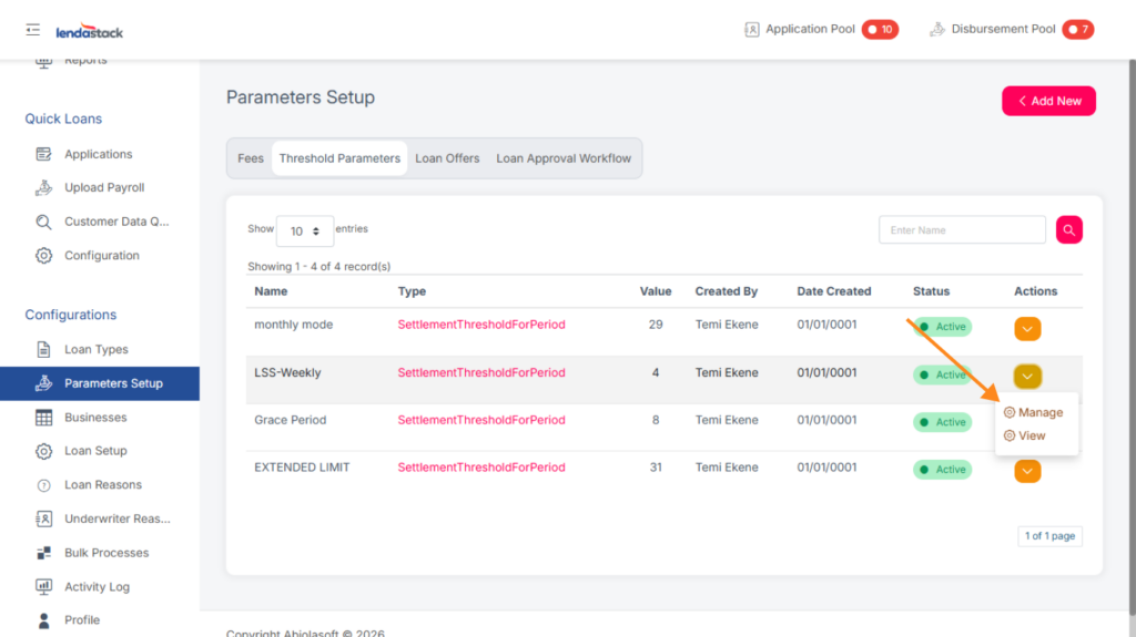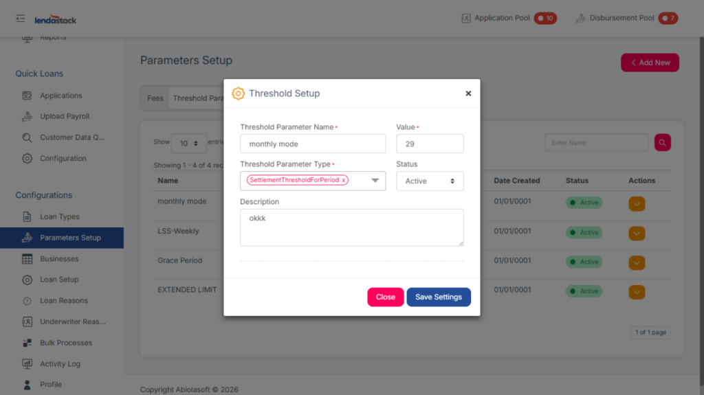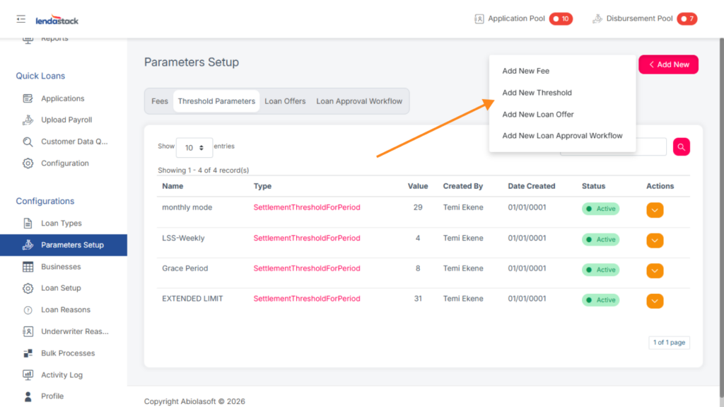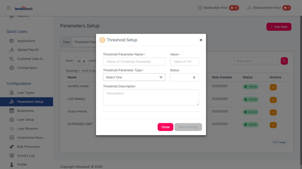 Required Permission: Create Threshold Parameter, Update Threshold Parameters, View Threshold Parameters