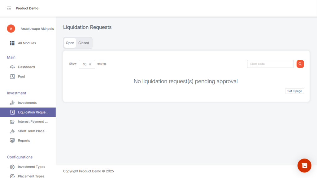 Liquidation Requests is where you view all customer or system-triggered requests to liquidate investments — either at maturity or via early liquidation.