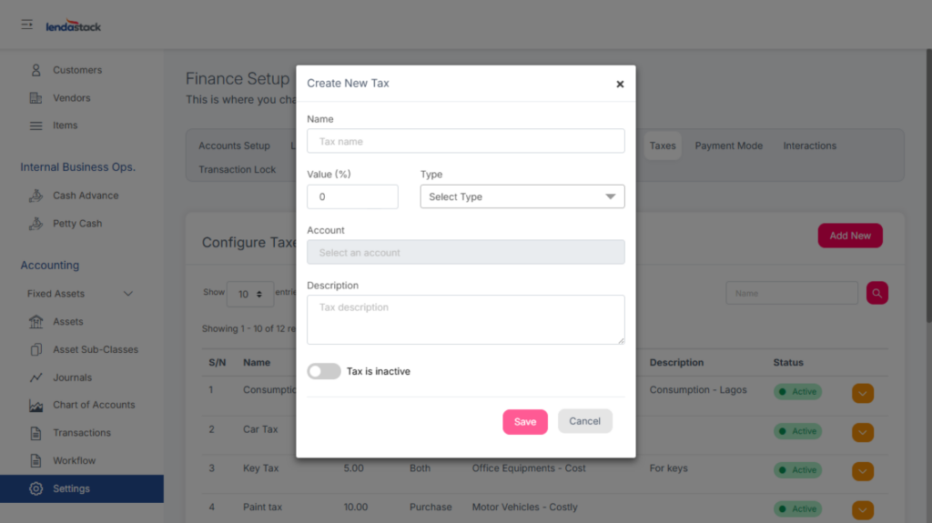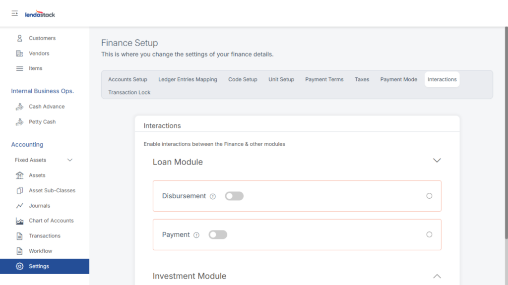 Enables integration between the Finance module and other modules (Loan, Investment, etc.). When toggled on, the system automatically generates transaction entries for disbursements, repayments, payouts, and liquidations.