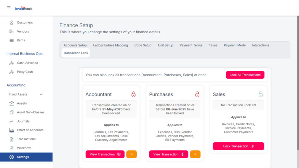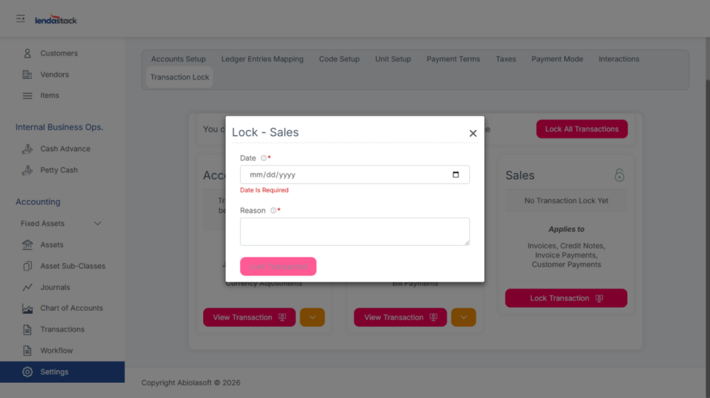 Allows authorized users to lock transactions for a specific period. Users can lock all transactions or specific categories, specifying the date and reason.