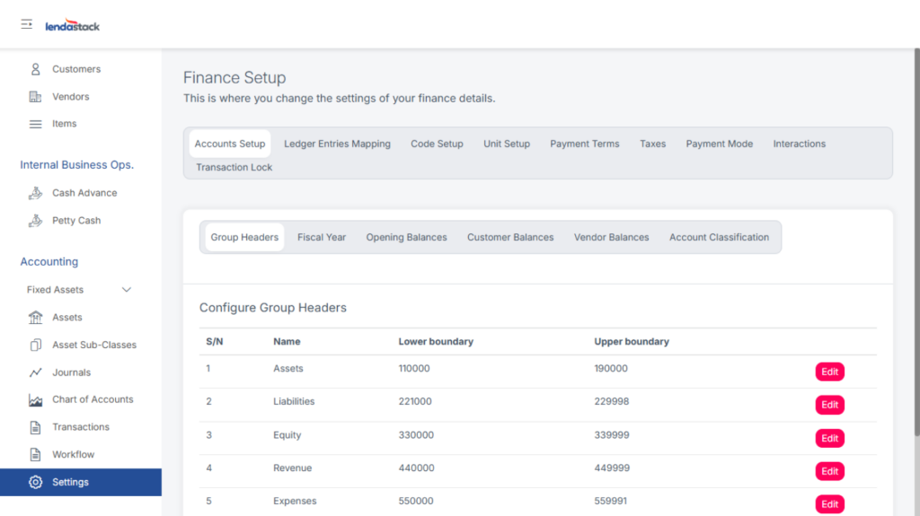 Configure group headers, fiscal year, account classification, and upload opening balances for customers and vendors. Download the sample format, fill in the data, and upload.