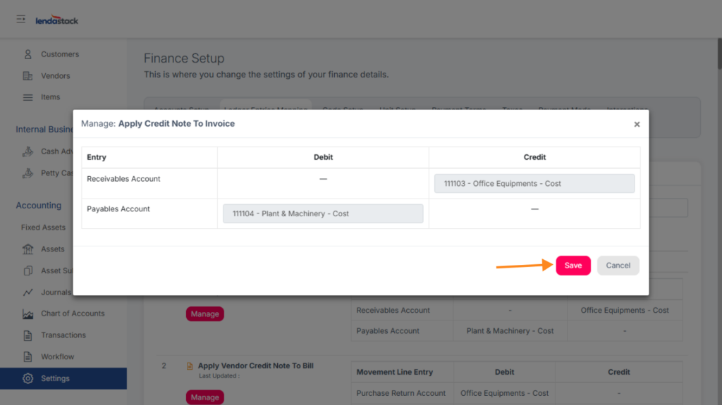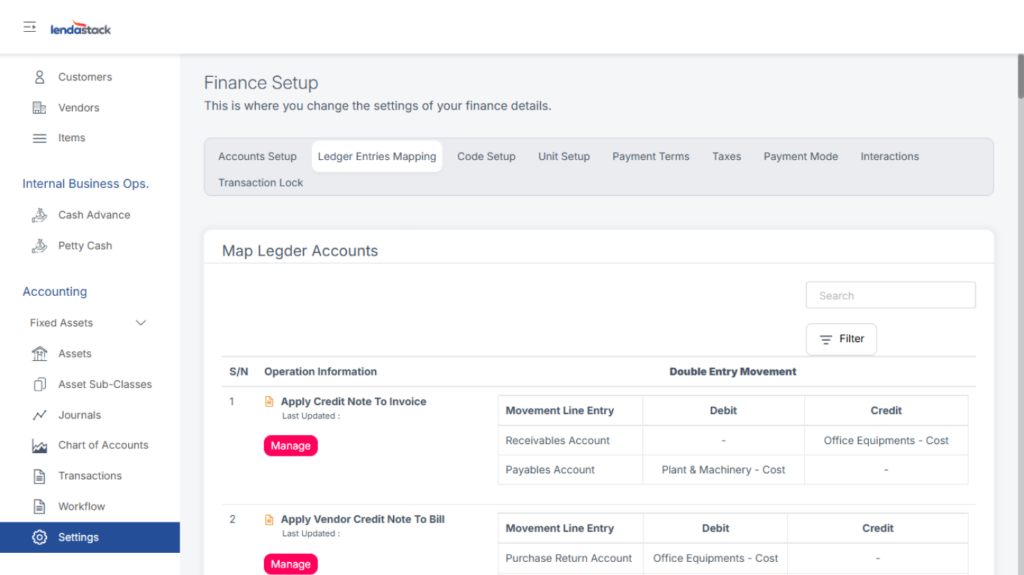 Map ledger accounts based on movement entries by clicking Manage, then select accounts, and save.