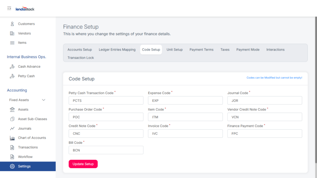Define system codes and click Update Setup once done.